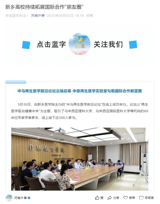 近日,中马再生医学前沿论坛(线上)在我校举行,论坛以“再生医学驱动健康未来”为主题,吸引了马来西亚理科大学、马来西亚国际医科大学等机构的60余位专家学者参会,线上线下近300人参与。本次论坛的举办标志着中马三所高校在医学科技领域的合作迈向更深层次。下一步我校将以中原再生医学实验室为依托,持续拓展与马来西亚高校的科研合作,通过“联合攻关+成果共享+产业联动”模式,为构建人类卫生健康共同体贡献智慧与力量。点点网页版入口官网网址、大河报•豫视频、今日头条、河南外事等多家媒体报道。